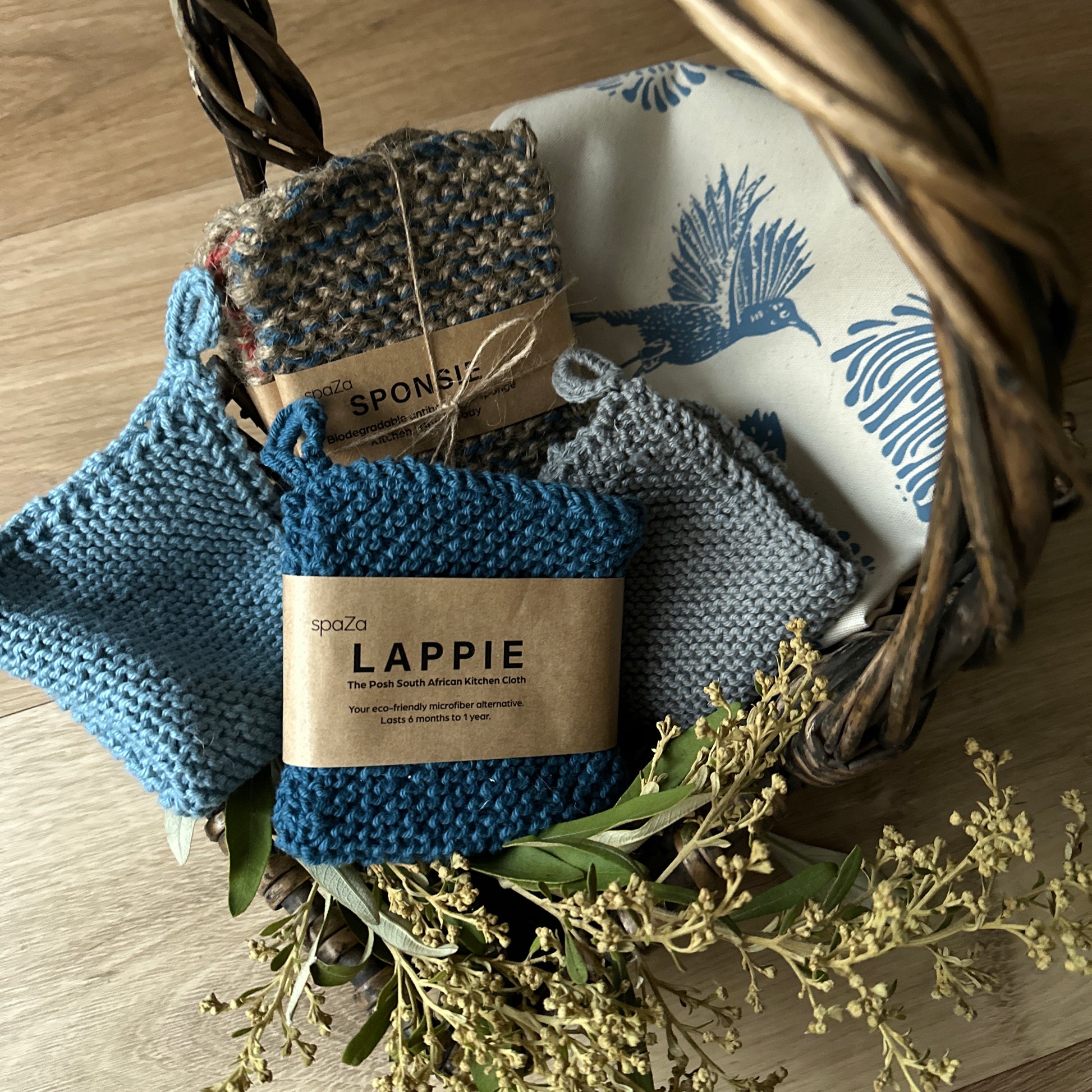 We’ve bundled everything you need for a spring clean in this eco-friendly, curated set. It includes a 3-pack of hand-knit cotton cloths in shades of blue, three multi-purpose cleaning scrubs, and a bright blue Sunbird print tea towel.