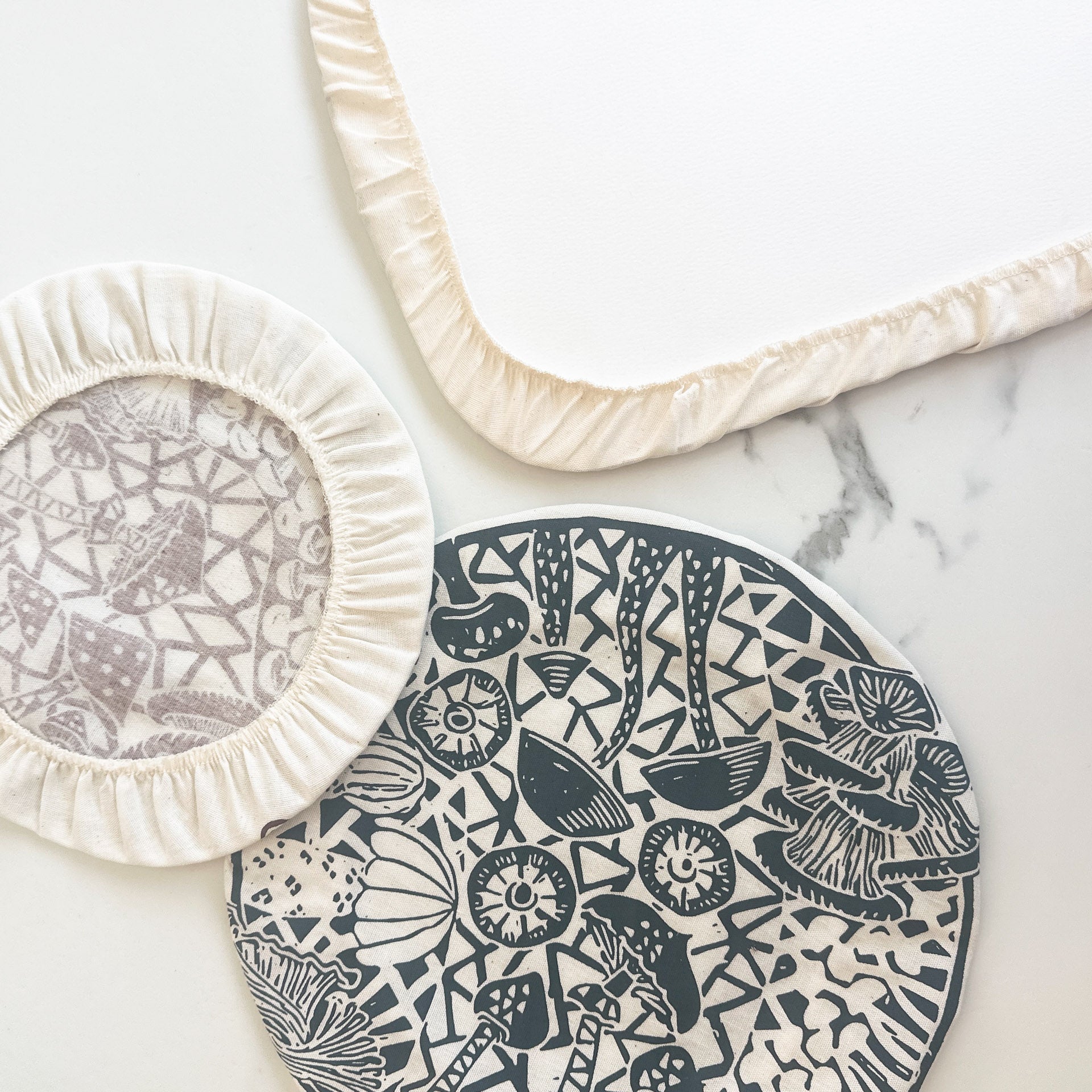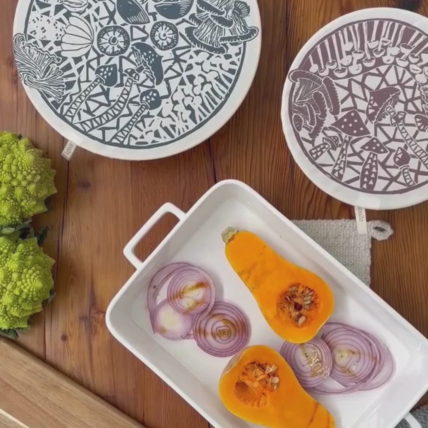 Perfect for plastic wrap free entertaining. Pack of 3 breathable covers for your lasagna pan, large salad bowl and medium salad bowl. Make covering food while transporting to a gathering or entertaining at home so easy time and again for years to come. Printed with our Mushroom Print combination in Mushroom Taupe, Night Blue and Rose Brown this makes a wonderful functional gift.