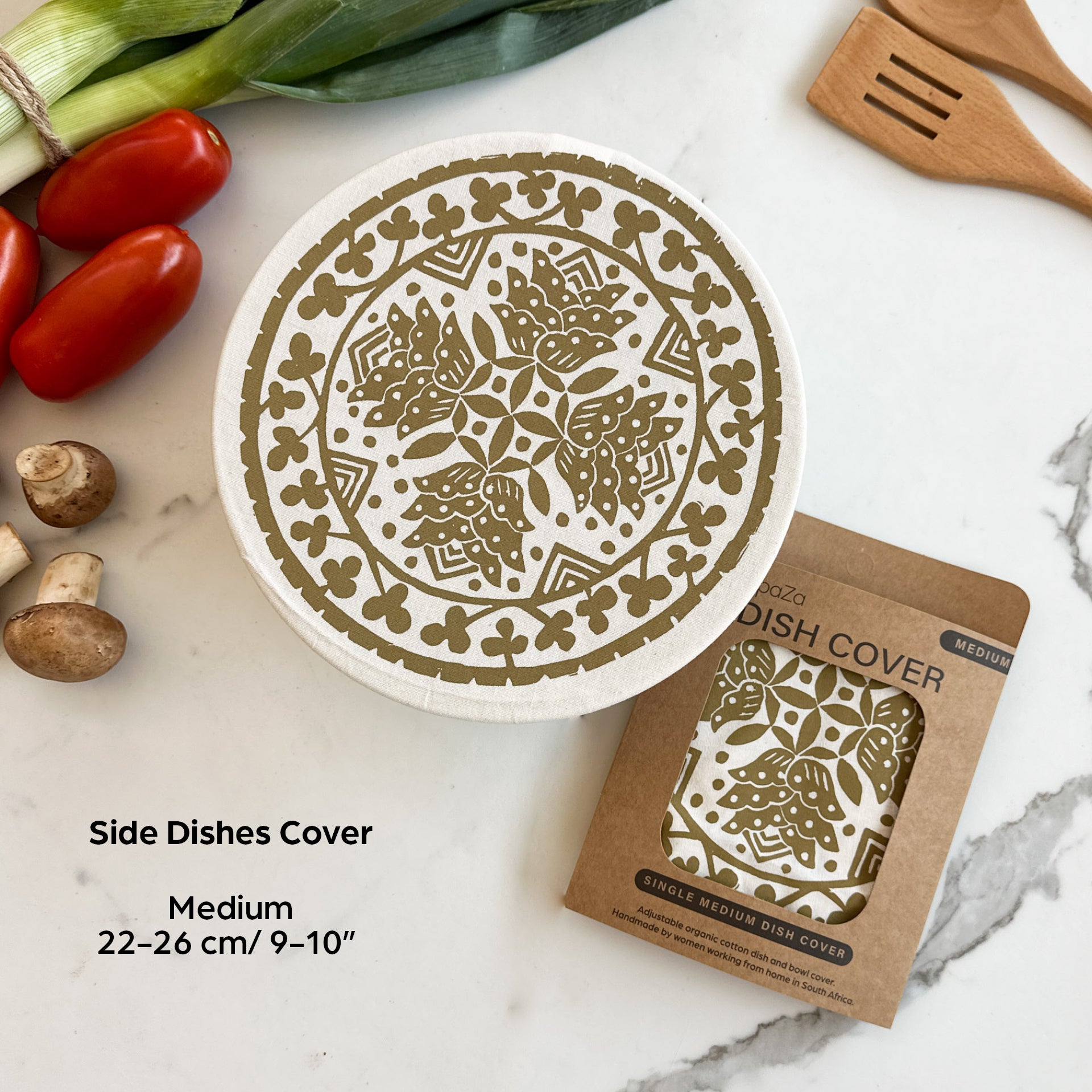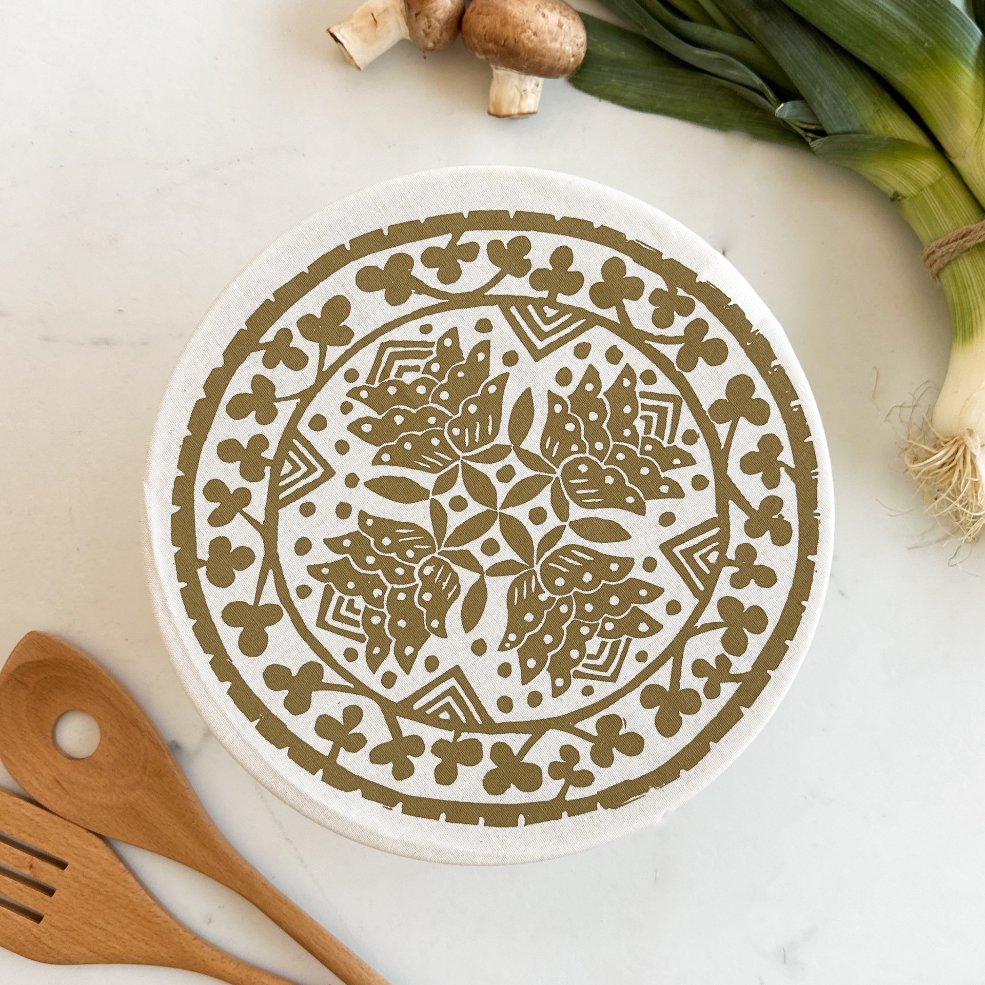 Say goodbye to plastic wrap with this easy, reusable dish cover, perfect for side dishes, salads, and pasta plates. Fitting 22-26 cm (9-10 in) dishes it keeps food protected in the fridge, on the counter and looks beautiful on the table. A practical and eco-friendly essential for every kitchen! This print is inspired by Nelson Mandela's iconic shirts and is derived from hand-carved stamps.