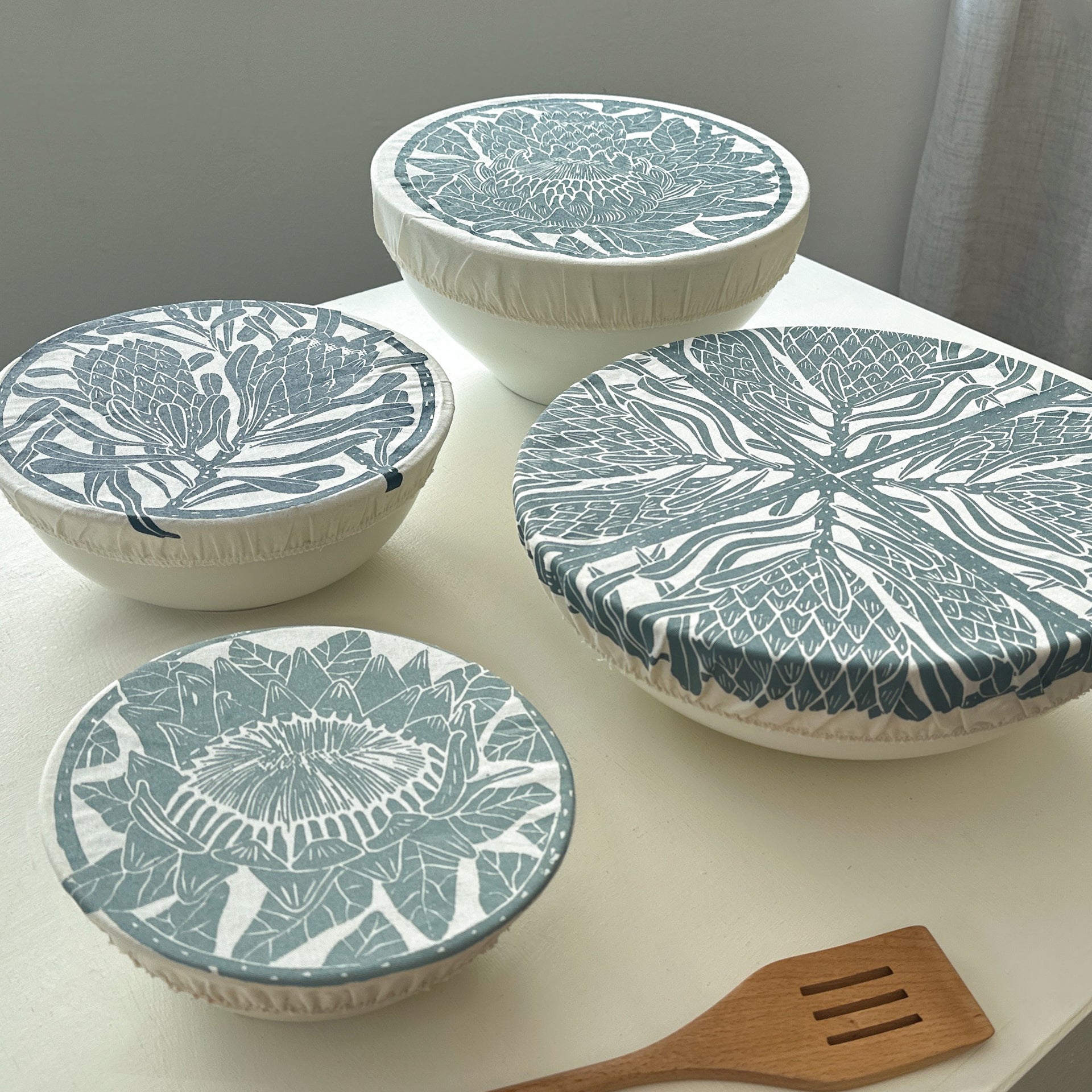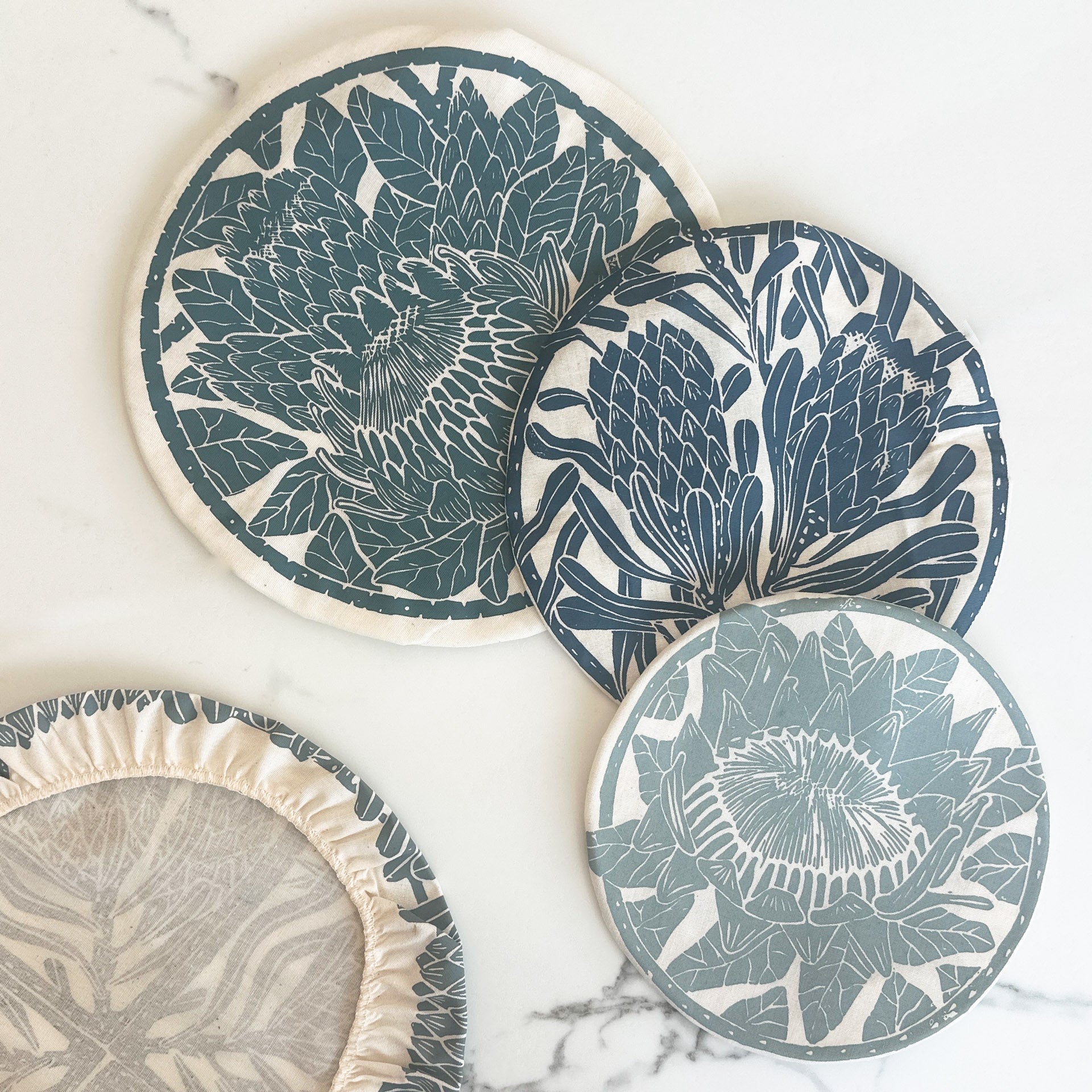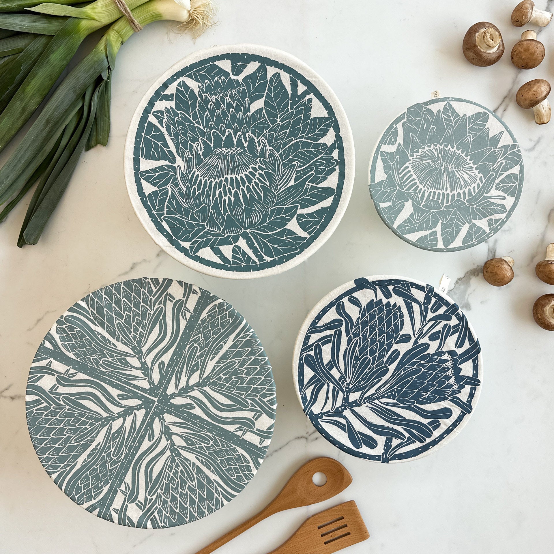 One set, zero plastic waste! With these four covers, you’ll always have the perfect size on hand—from everyday meals to weekend entertaining, no cling wrap needed. Includes Protea printed small in Slate, medium in Ocean Blue, large in Spruce and Extra Large in Atlantic Green.
