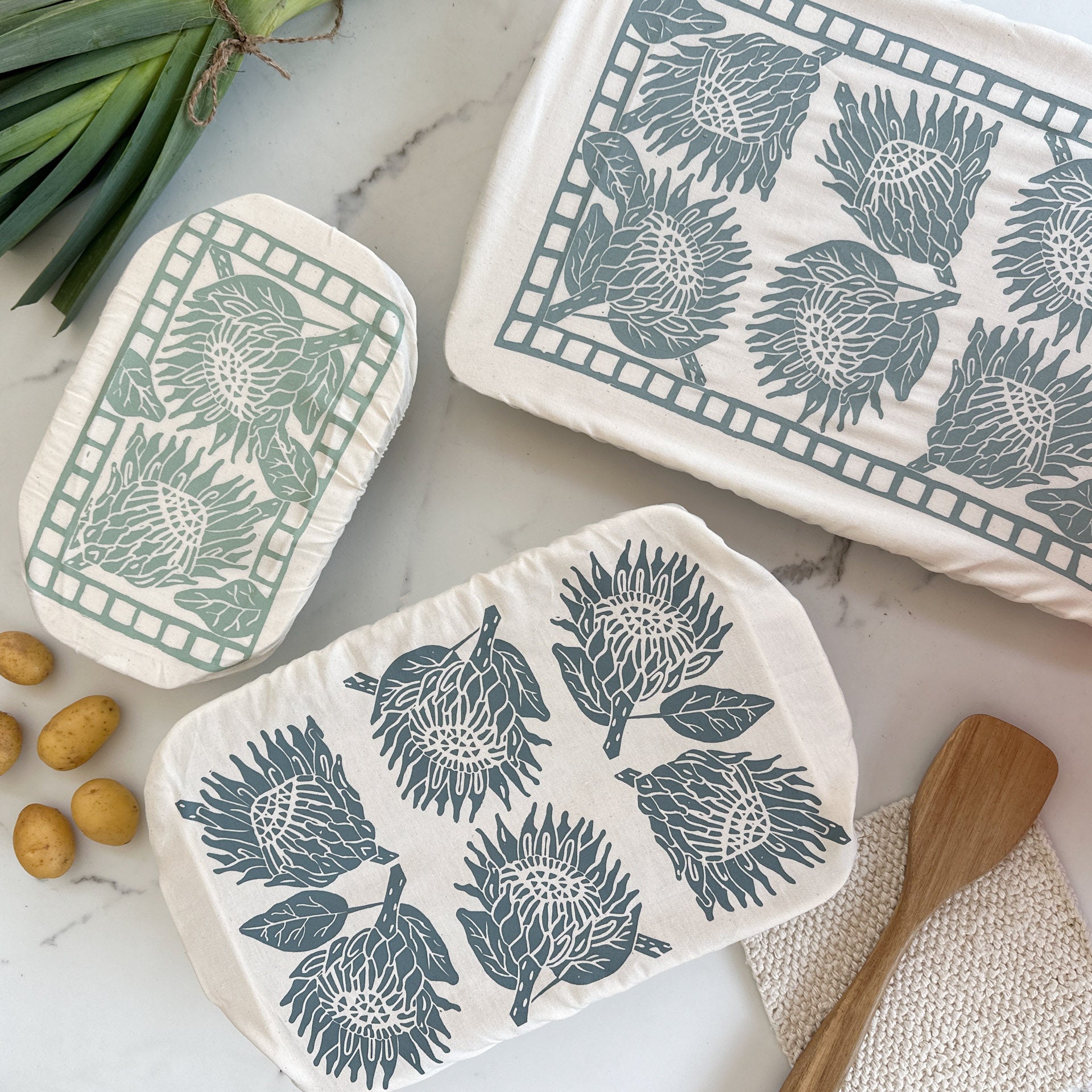A set of three adjustable cotton rectangle dish covers to fit every casserole dish in your kitchen, saving you tons of single-use plastic wrap. The extra-large cover in Slate Green is perfect for a barbecue or pot luck, the lasagna pan size cover in Atlantic Blue, and the small casserole or loaf pan cover in Moss Green. Hand-printed in our classic Protea print, these covers are a long-lasting family favourite and a beautiful, functional gift.
