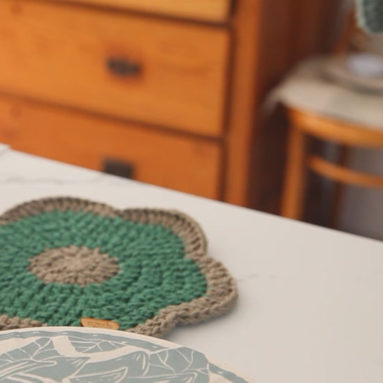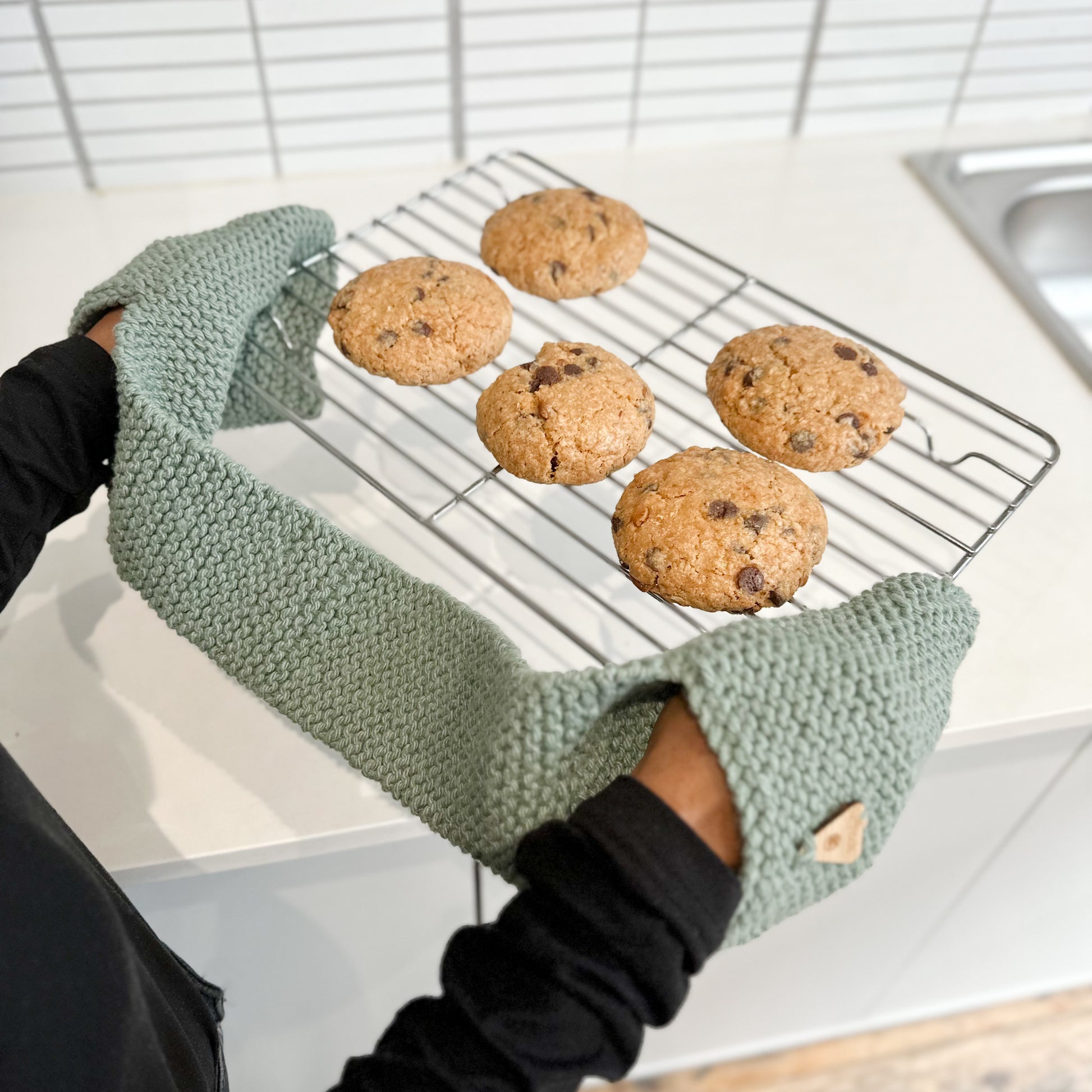 Hand-knitted from thick cotton and free from petroleum-based materials, these eco-friendly oven mitts are designed for both sustainability and safety. The clever design features heat-resistant padding only in the mitt section, providing effective protection without excess bulk. Lightweight, biodegradable, and machine washable, these long-lasting double oven mitts are as practical as they are beautiful.
