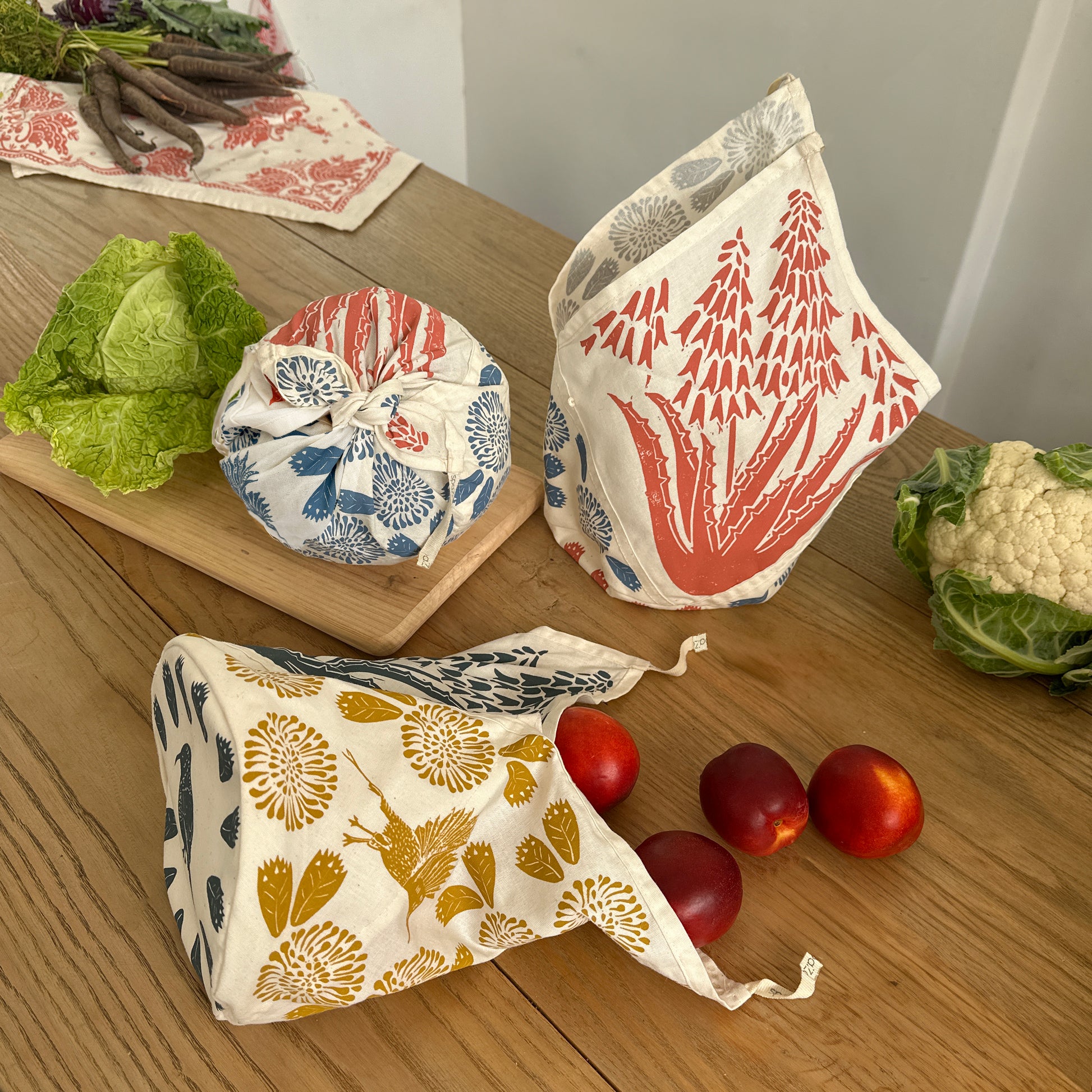 These are the perfect produce bags! Bucket shaped with a cushioned bottom to protect delicate peaches and holds moisture when using as a dampened storage for broccoli. Tall sides support large hauls and the bento tie design allows for easy access and secure bundling. Individually handprinted with our Sunbird print, they also make cute bags for lunches, picnics, bread, toiletries, craft projects.